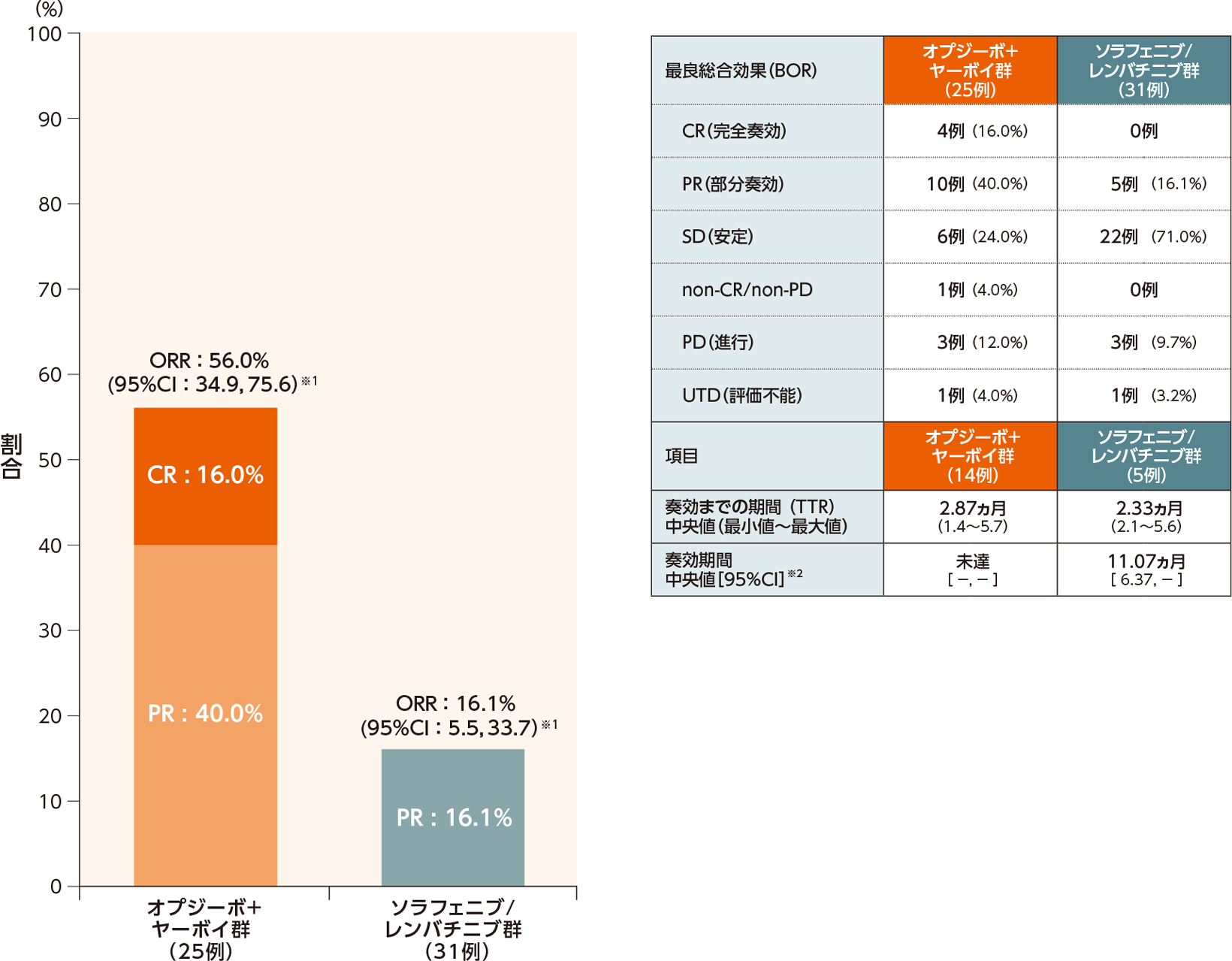 日本人部分集団における奏効率(ORR、RECISTガイドライン1.1版に基づくBICR)は、オプジーボ+ヤーボイ群で56.0%(95%信頼区間[34.9, 75.6]※1)(14/25例)、ソラフェニブ/レンバチニブ群で16.1%(95%信頼区間[5.5, 33.7]※1)(5/31例)でした。